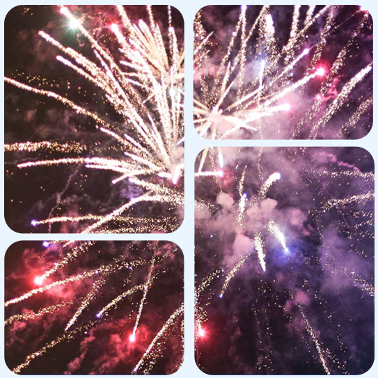 In the night sky, fireworks suddenly burst into bloom, akin to dazzling stars pouring down. The golden and red interwoven light arcs tear through the night, with silver-white sparks falling like a meteor shower. Layers of purple and blue halos gradually spread, accompanied by deafening roars. In a fleeting moment of beauty, the sky is filled with fireworks reflecting the lights of the world, and the sulfur smell, mixed with cheers, captures a momentary eternity amidst the flickering lights.
